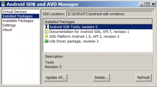 - then I run “SDK setup.exe” from directory where I unzipped SDK (E:\DVD\HTC\android-sdk-windows)
