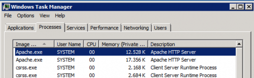 After you configured and started OHS instance, you can check with Task Manager that apache.exe is indeed running as 64-bit application:
