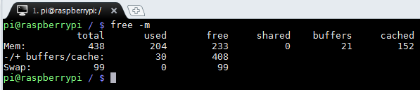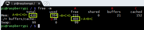 Second line is a look at the memory from process perspective rather than kernel. This is the line of interest. 30MB is used by running processes. With -/+ the “free” is trying to point out that buffer/cache has been removed (-) from “used” column and added (+) to “free” column. Why? Because the second line as I pointed above looks at memory from process perspective and any process can get portion of memory from buffer/cache if needed. So, having 408MB of free memory for user processes on my RPI looks much better than 233MB :-).