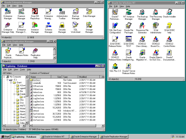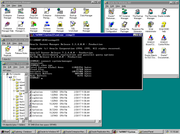 For the record: installation of the Windows NT 4 took ~10 minutes. Installation of Oracle 7.3.4 with Replication option took another ~10 minutes (including building a database). It took 1.3GB of disk space for both OS, RDBMS and sample database. For comparison, Oracle 12c R2 ISO file with all the components is 9.7 GB.